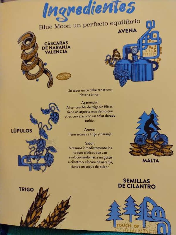 Blue Moon es una cerveza Ale estilo Belgian White sin filtrar, de 5,4º, color dorado turbio y, lo más diferenciador, elaborada en base a trigo, avena, semillas de cilantro, malta y cáscaras de naranja Valencia, ingredientes que le entregan un sabor y aroma único e irresistible.