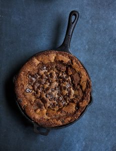 Una gran galleta para compartir es la que resulta si, en vez de porcionar la masa, se vierte completa en un sartén que pueda ir al horno. Y a la mesa.