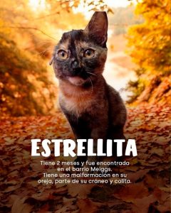 Estrellita: Esta minina de dos meses fue encontrada en el barrio Meiggs. Tiene una malformación en su oreja, parte del cráneo y colita.