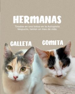 Galleta y Gomita: Son dos hermanas felinas que fueron tiradas en una bolsa en la Autopista Américo Vespucio, cuando tenían solo un mes de vida.