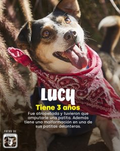 Lucy: Fue atropellada y tuvieron que amputarle una patita. Además, esta perrita tiene una malformación en una de sus extremidades delanteras, pero nada es impedimento para que a sus tres años encuentre un hogar definitivo que le brinde todo el amor que merece.