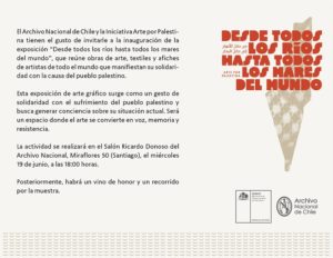 Es una exposición que reúne obras y afiches en solidaridad con Palestina, en la que participarán artistas y creadoras chilenas, palestinas y de otras nacionalidades, abordando la lucha palestina o manifestando su solidaridad con la causa.