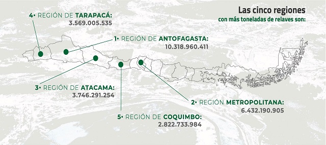 En el informe se hace un recorrido por la distribución geográfica de los depósitos, identificando que las cinco regiones con más toneladas de relaves son Antofagasta, seguida por la RM, Atacama, Tarapacá y Coquimbo.