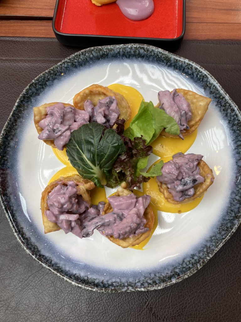 Dos appetizers o entradas estrellas son el “Wantan Relleno”, masas fritas rellenas de camarón y cebolla flameado al vino blanco con topping de pulpo al olivo. junto a las “Empanadas de Ceviche”, ceviche de salmón, pulpo y calamar envuelto una fina masa frita.