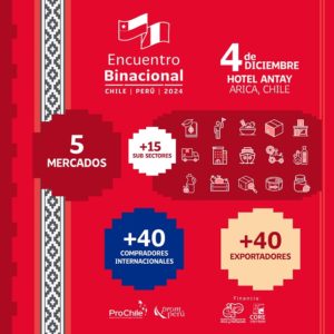 Ignacio Fernández, director general de ProChile, señaló que “Chile y Perú son históricos socios comerciales, con un intercambio que en 2023 sumó alrededor de US$ 3.398 millones, con exportaciones no cobre no litio por US$ 1.607 millones, lo que muestra que somos dos economías muy complementarias. Por eso esperamos que este nuevo Encuentro Binacional, contribuya a seguir fortaleciendo nuestros vínculos y con los países invitados, para continuar diversificando mercados para los bienes y servicios chilenos, especialmente las pymes y espacios de colaboración y negocios conjuntos para nuestras empresas”.