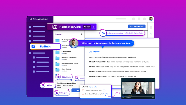 Zia Hubs hace parte de Zoho WorkDrive, lo cual lleva inteligencia de contenido a la plataforma unificada de gestión y colaboración de la compañía. Diseñado con un alto nivel de control sobre los datos por parte del usuario, Zia Hubs permite almacenar y organizar tareas o archivos específicos de algún proyecto dentro de centros específicos de contenido (o hubs) en WorkDrive. Cada hub funciona como un espacio dedicado donde Zia, la IA insignia de Zoho, puede entender y trabajar con el contenido almacenado en él. Esto incluye un amplio rango de formatos de contenido, como PDF, documentos de texto, videos, y archivos de audio.